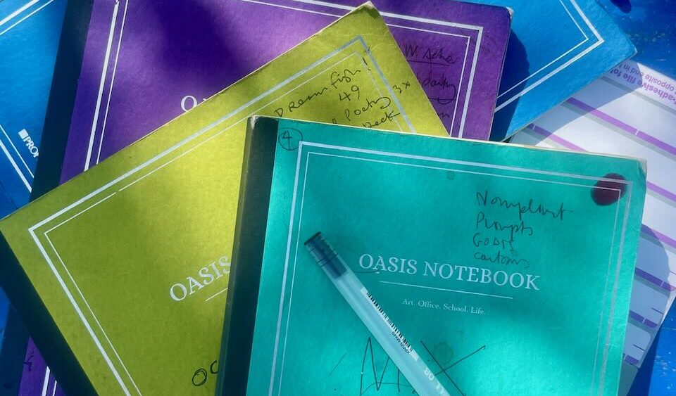 Well jeez, thanks for asking! I’m sure many of you will be riveted to learn that I have a complex and extremely low-tech system for organizing my paper stacks of thought. In an earlier letter I described my daily writing practice, which essentially consists of getting myself to sit and write for 30 mins every day BEFORE getting caught up in the myriad things. I sit on a little bench, with my tea next to me, and my notebook opened on a drawing board. After years of dalliances with different notebook types, I am now wedded to the Japanese Profolio OASIS, lightly lined (though I ignore the lines), with a pleasing smoothness of paper, and a spine that can bend all the way back, like a gymnast.